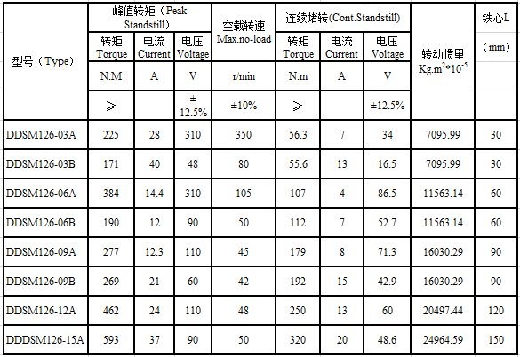 DDSM126 series brushless drive motor parameter performance table